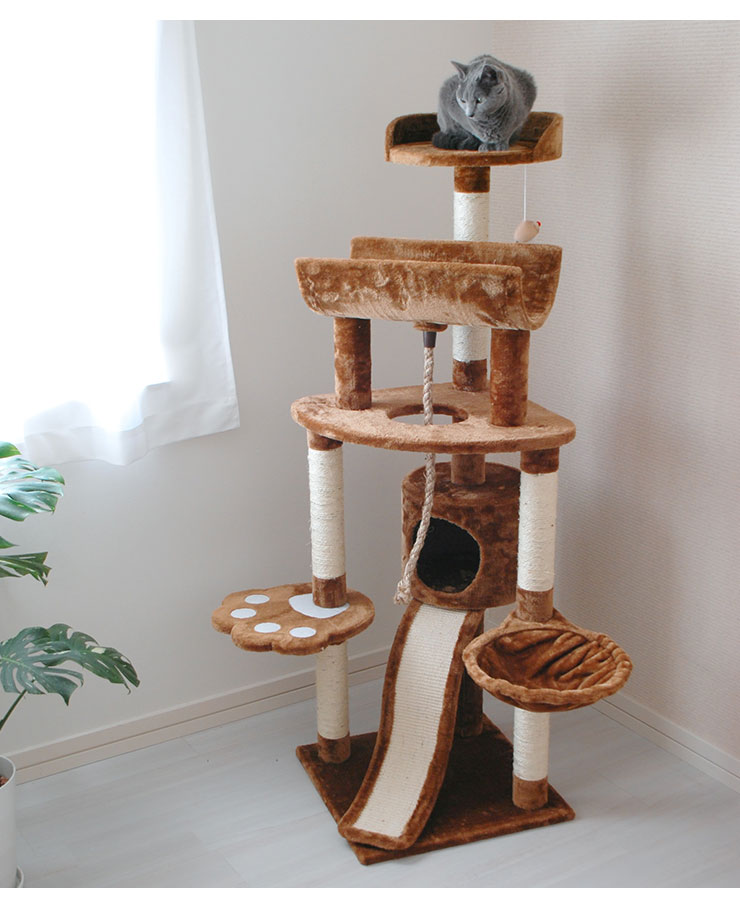 ・ボックスやバスケットをはじめ、すべり台風の爪とぎ等々・・・遊びどころ満載の理想のキャットタワー!・据え置き型だから、高いところが苦手なネコちゃんでも安心!・カラーはブラウンとホワイトの2色ございます。