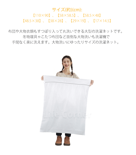 アイテム情報 商品仕様 内容:洗濯ネット7枚セット 素材:ポリエステルメッシュ サイズ(約):110×90cm、58×58.5cm、58.5×48cm、 48.5×38cm、38×28cm、29×19cm、17×14.5cm 商品ポイント ・衣服を保護する、ほかの洗濯物と絡みつくを防ぎ、服を型崩れや毛羽立ちから守ります。
