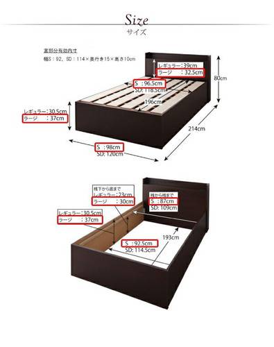 ベッドフレーム【サイズ】本体最大外寸<レギュラー・ラージ>シングル:(約)幅98×長さ214×高さ80cmセミダブル:(約)幅120×長さ214×高さ80cm床から床面までの高さ<レギュラー>シングル・セミダブル:約30.5cm<ラージ>シングル・セミダブル:約37cm収納部有効内寸<レギュラー>シングル:(約)幅87×長さ193×深さ23cmセミダブル:(約)幅109×長さ193×深さ23cm<ラージ>シングル:(約)幅87×長さ193×深さ30cmセミダブル:(約)幅109×長さ193×深さ30cmコンセントの長さ:約140cm【材質】プリント化粧繊維板【その他】2口電源コンセント(1500w)【生産国】日本【カラー】ダークブラウン/ホワイト/ナチュラル【耐荷重】全サイズ共通:約180kg【重量】<レギュラー>シングル:約35kgセミダブル:約40kg<ラージ>シングル:約38kgセミダブル:約43kg【梱包サイズ・梱包重量】<レギュラー>シングル:(約)100×20×83cm・12kg、100×4×31cm・3kg、95×92×10cm・8kg、34×199×10cm・17kgセミダブル:(約)123×20×83cm・14kg、123×4×31cm・4kg、115×92×10cm・11kg、34×199×10cm・17kg<ラージ>シングル:(約)100×20×83cm・12kg、100×4×39cm・4kg、95×92×10cm・8kg、41×199×10cm・20kgセミダブル:(約)123×20×83cm・14kg、123×4×39cm・5kg、115×92×10cm・11kg、41×199×10cm・20kg※サイズ・重量は概算です。