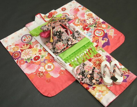 商品情報 商品番号 k7fu-39 セット内容 着物 帯 帯飾り紐 長襦袢 重ね衿 草履 バック 帯〆 箱セコ 扇子 ビラカン 正絹帯揚 しごき 白足袋 子供用腰紐3本 刺繍半衿 着付け解説DVD 肩上げ(希望者のみ) カラー 着物 白色×ピンク色帯 黒ちりめん友禅柄 帯揚、しごき 4色の中から選べます刺繍半衿 2色の中から選べます 素材 【着物、胴裏、長襦袢】ポリエステル100%【帯】ポリエステル100%、【箱セコセット】ポリエステル、合皮 サイズ 対象年齢 おもに6歳、7歳、8歳対応身長 約110cm〜135cmくらい身丈 約132cm袖丈 約76cm裄丈 約57cm 草履 草履判サイズ 6〜7歳用 約21cm(足のサイズ約19cm〜21cmくらいに対応します)かかと高さ 約4.5cm ご注意 ※生地の裁断位置により多少柄の出方が変わることがございます※店舗での並行販売も行っていますので箱に多少の汚れがあります。